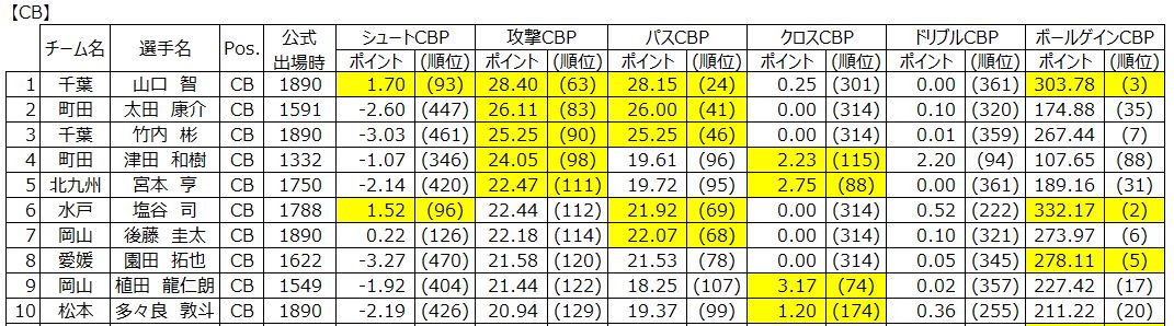 続いてセンターバック(CB)部門では1260分以上の出場選手30人の中から選出した。クロスCBPとドリブルCBPがほとんど発生しないポジションなので、攻撃CBP、シュートCBP、ボールゲインCBPの3指標を基準に選定。まず一人目は山口(千葉)。攻撃CBPでトップをマークし、特にパスCBPは全体でも24位に入っており、後ろからのチャンスメーク力No1と言える。シュートCBPも全体で3位、前半戦終了時点で3得点をマーク。また、ボールゲインCBPが3位で、千葉最小失点の要であることを数字でも証明している。