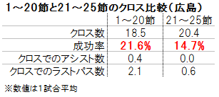 優勝争いに残るためにも、これ以上の連敗は阻止したい広島。右表を見ると、勝利から遠のいている直近の5試合はそれ以前に比べてクロスの成功率が下がっており、そのままシュート数の減少にもつながっている。サイドからのチャンスメイクがキーとなりそうだ。