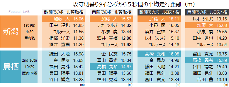 次の表は、攻守が切り替わったタイミングから5秒間の走行距離の平均値をまとめたものだ。甲府戦の加藤は自チームがボールを奪った際、奪われた際ともにチーム上位の走行距離を記録。4-1-4-1の中央2列目というポジションであることもあり、攻守両面で奔走している。一方で横浜FM戦の高橋は、4-3-1-2のアンカーを担っている影響もあり、チームが高い位置でボールを奪っても走る必要性がなく、敵陣でのボール奪取時はランク外となり、自陣でのボール奪取時も3位となっている。唯一チームトップとなったのは敵陣でのロスト時のみ。攻守が切り替わるタイミングだけを見ると、圧倒的に加藤が走っていることが分かる。