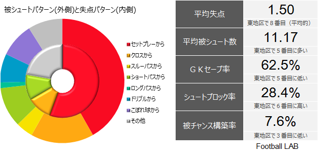 攻撃面ではポジティブなデータが並んだが、守備面ではいくつか課題があるようだ。グループステージでは、アデレードユナイテッド(オーストラリア)を相手に2戦合計6失点を喫したため、平均失点は高い数値に。被シュート数も多く、攻撃の数値をそのまま反転したようなデータとなっている。特に、セットプレーの失点と被シュート数の多さが目立っている。また、被クロスからの被シュート数も多いため、浦和としては得意のサイド攻撃からゴールを奪いたい。