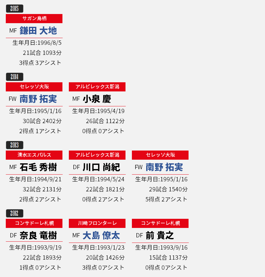 ※1:各シーズンで全体の3分の1以上のプレータイム(J1の場合は90分×34試合÷3=1020分以上の出場)