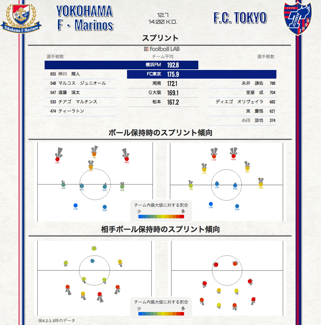 保持時以上に相手保持時の両者の違いが大きく、ラインが高い横浜FMは最終ラインの選手の後方へのスプリントが圧倒的に多い。逆にFC東京は突出したスプリント数を記録するポジションがなくDF、サイド、FWのスプリントがチーム内の上位となっている。これも両者のチームスタイルの違いから表れた傾向と言えるだろう。両チームともにセンターバックの選手のスプリント数が2選手で大きく異なる傾向にあり、守備での役割の違いや近いサイドバックの選手との関係が影響している。スプリントの数そのものだけが評価となるわけではないので、その点は注意したい。