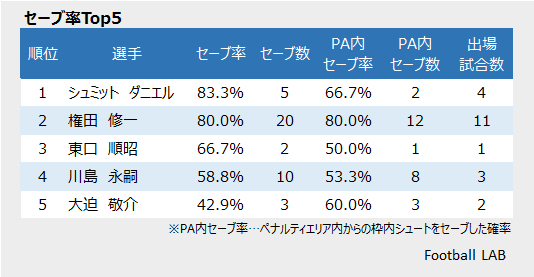 GKでは権田修一が約半分の11試合に出場し、守護神争いで一歩リードしている。80.0%を記録したセーブ率もさることながら、注目したいのはPA内セーブ率だ。他の選手らが70.0%にも満たない中で、80.0%をマーク。権田のスーパーセーブに何度も助けられたことも忘れてはならない。