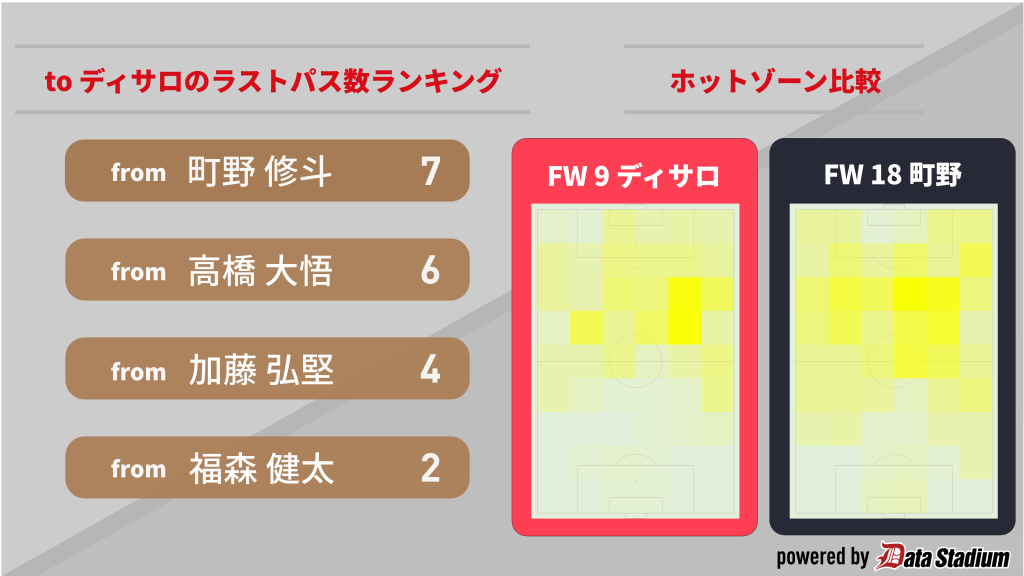 [藤] ディサロ選手のシュート前に誰がパスを出しているかを見てみると、町野選手が最も多いことが分かります。また、2人のホットゾーンを比較すると、町野選手が広範囲にボールに関わり、ディサロ選手はゴールに近い位置でのプレーが多くなっていることも分かりますね。ディサロ選手にとってはベストパートナーといえるかもしれません。
