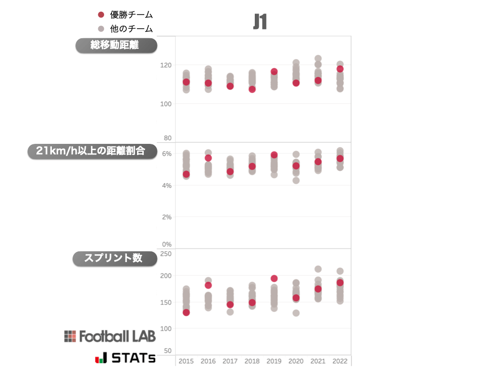 J1の場合、得失点やプレーデータでは分かりやすい傾向が出ていたがトラッキングデータにおいてはチームによって大きく異なる。総移動距離でいえば2017,2018,2020,2021の川崎Fは短く、2019,2022の横浜FMは長めだ。21km/h以上の移動距離割合やスプリント数も優勝チームが高いとは限らない。チームの戦い方によって移動量やスピードの増減が発生するため、そういったサッカーをしている場合はより数値を上げていく必要があるが、この数値を上げれば優勝するというわけではないと言える。